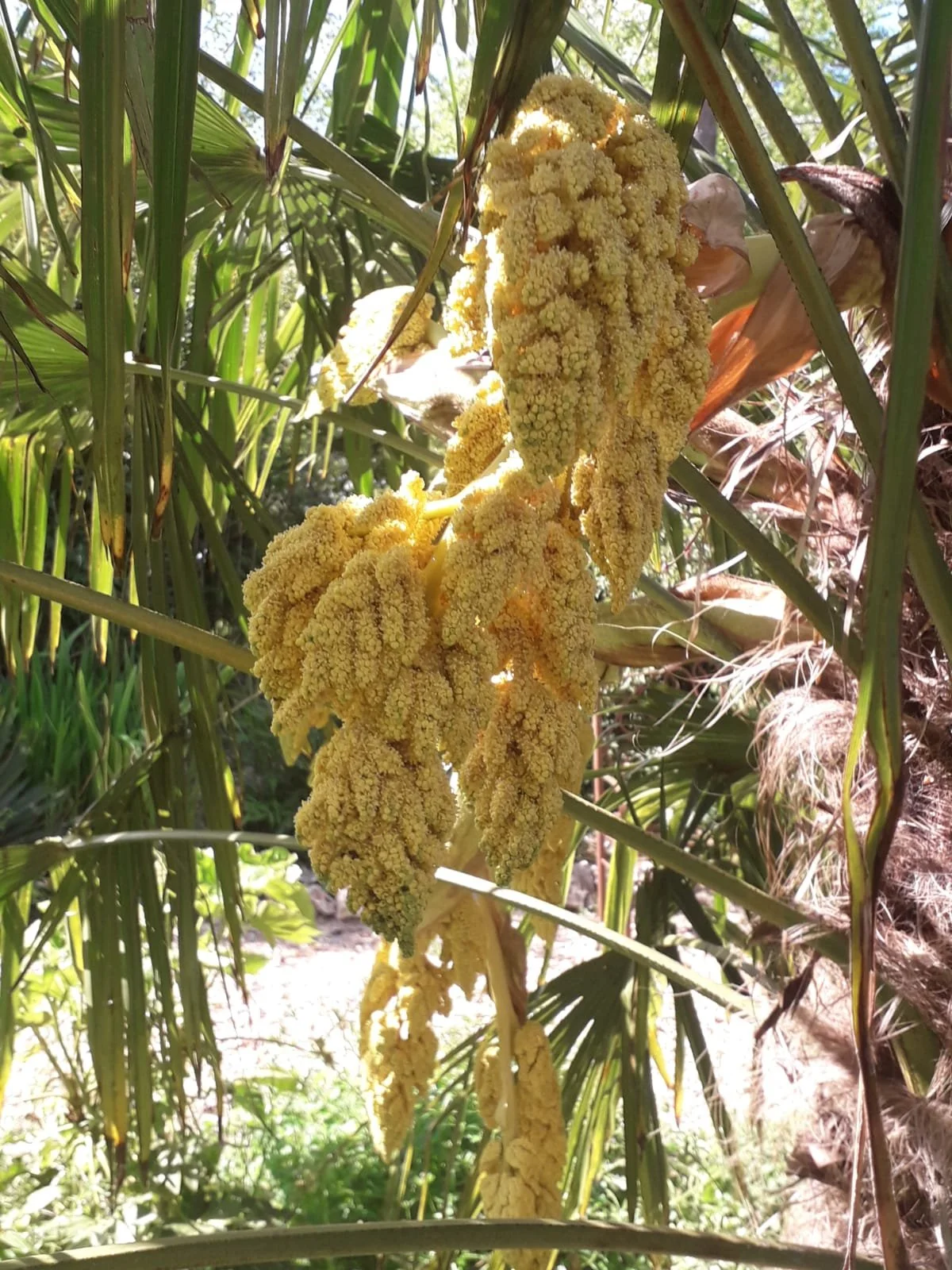 Gravel garden with palms, banana, tetrapanax and bromeliads.