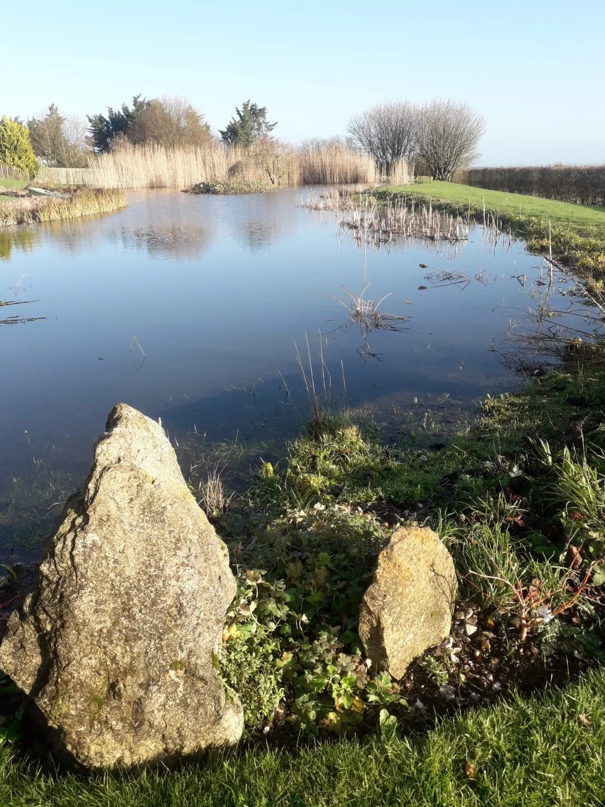 Swimming lake, surrounded by mass of orange Hemerocallis in the summer